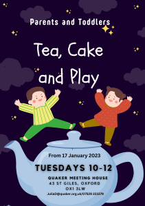 Are you a parent, grandparent or carer of a baby or toddler? Come to Cake and Play, our new weekly morning chat and fun session for babies, toddlers and their grown-ups on Tuesdays from 10:00-12:00 at Oxford Quaker Meeting House, starting on 17th January 2023.